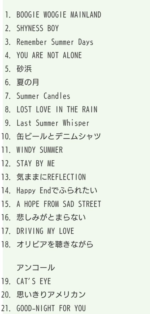 オープニングは、❝BOOGIE WOOGIE MAINLAND❞だった。杏里の12枚目のアルバムで、杏里のサーフ系の名曲❇️❝最後のサーフホリデー❞や❝SUMMER CANDLES❞が収録されているアルバムのタイトル・チューン🎶だ。