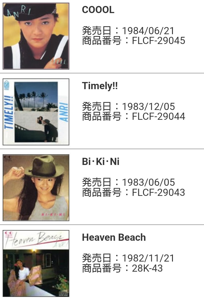 ❝砂浜〜夏の月❞と名曲が続き、BOOGIE WOOGIE MAINLANDのアルバムから杏里の代表曲の1つ、❝Summer Candle🕯️❞そしてTimely!!から❝Lost Love in The Rain❞と、バラードが続き、角松敏生が杏里に初めて作品の提供をしたアルバムHeaven Beachから、おいらが好きな❝Last Summer Whisper❞この曲は角松敏生の曲で、ソウルフレイヴァ〜🤎が効いている”角松としき”というより、”角松らしき”バラードだ。このアルバムから角松敏生が作品提供を始めてよりポップ🍿にファンキー🎶にそしてソウル🤎フレイヴァー溢れる杏里のブレイク💥のきっかけになったアルバムだ。下の4枚が杏里の最重要アルバムだ。全て角松敏生がプロデュース又は作曲編曲をしている。(もちろん一部、林哲司や小林武史も楽曲提供やアレンジも行っている)
