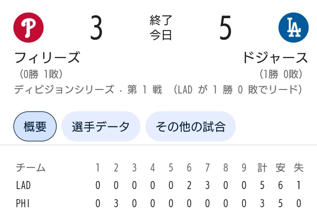 ドジャースは7回以降、タイラー・グラスノー、アレックス・ベシアと継投。9回は佐々木朗希をクローザーとして起用し、フィリーズ打線を抑えた。