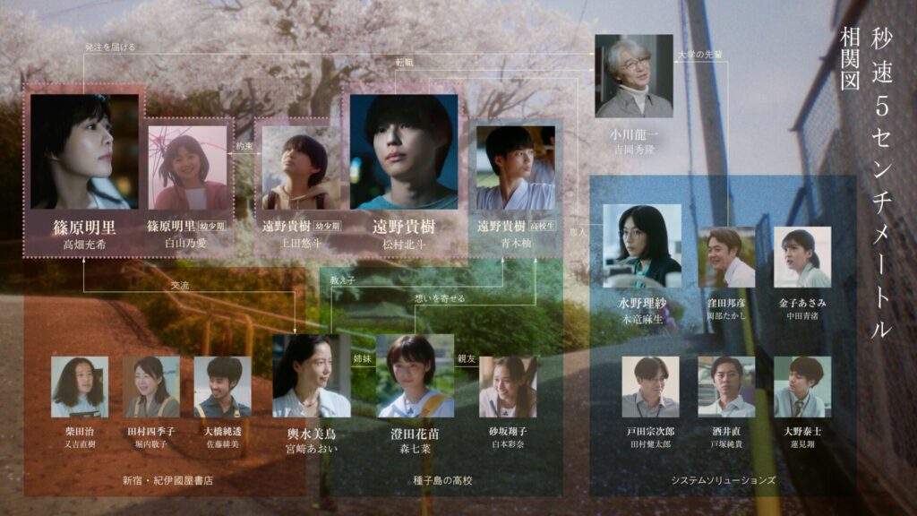 1991年、春。東京の小学校で出会った遠野貴樹と篠原明里は、互いの孤独に手を差し伸べるように心を通わせるが、卒業と同時に明里は引っ越してしまう。