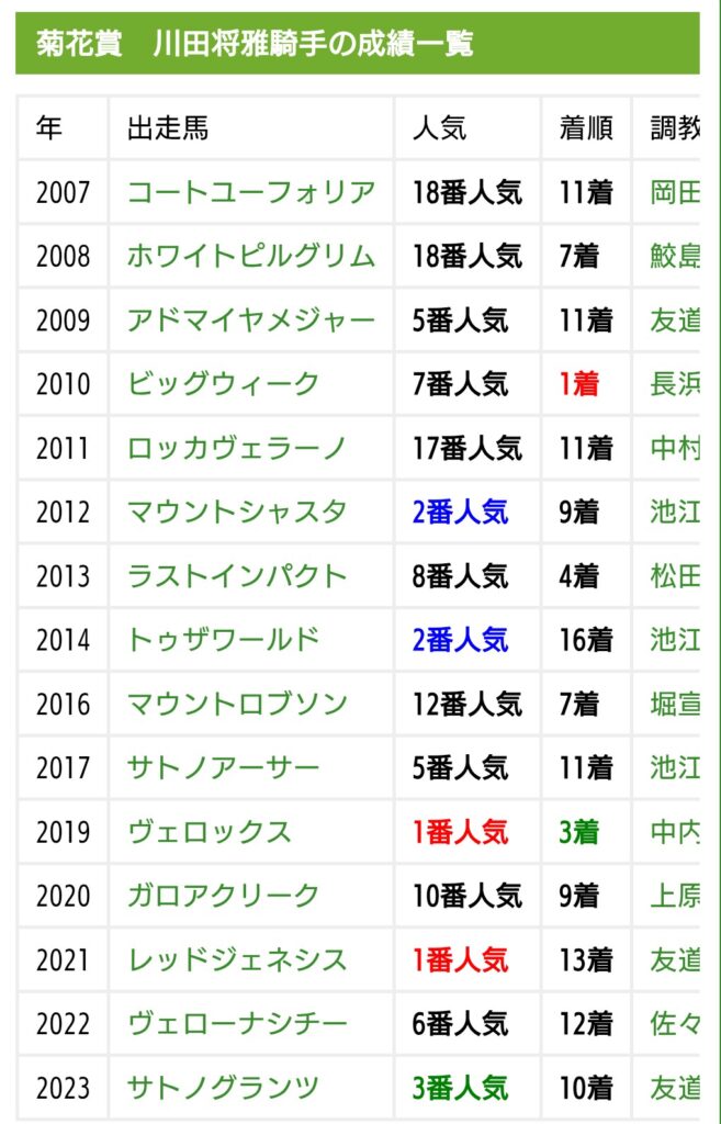 図を見ての通り、騎乗回数17回で僅か1勝、2着は無しで3着1回。信じられないが、川田は長距離が苦手と言わざるを得ない。しかし杞憂に終わる可能性も大いにある。