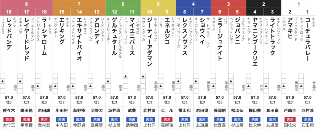 目下2連勝中のミラージュナイト(牡、辻野)は3枠6番からG1初制覇を狙う。枠順を見た藤岡佑騎手は「偶数の内枠なので言うことないです。ポテンシャルを感じる馬で、順調に成長しています。春に比べて良くなっています」と、成長力を武器に戴冠を狙う。