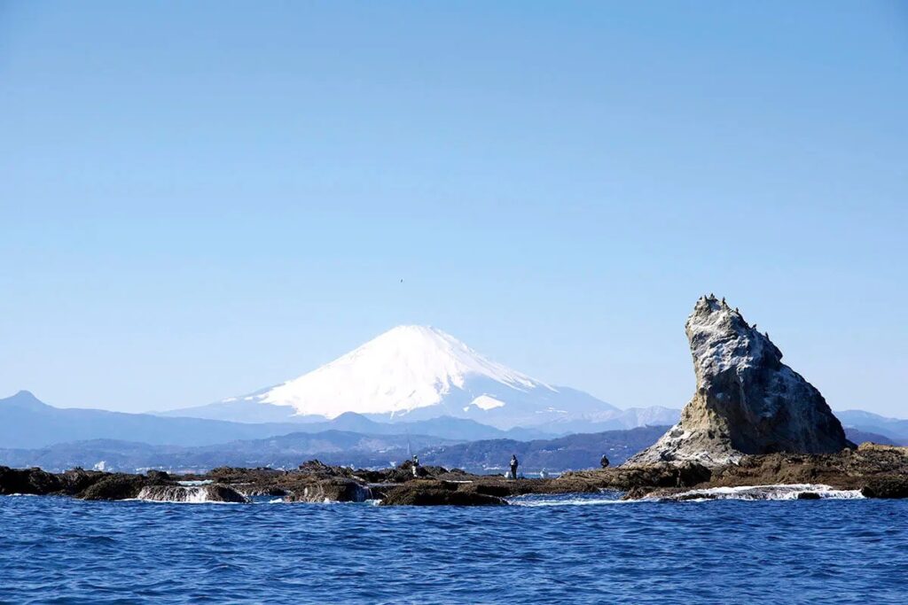 ビーチの正面にはサザンの曲の歌詞にも入っている尖った形が特徴の「えぼし岩」、東に「江ノ島」、晴れた日にはえぼし岩の先に「伊豆大島」、西に「富士山」の美しい景色が見られるのも魅力✨️