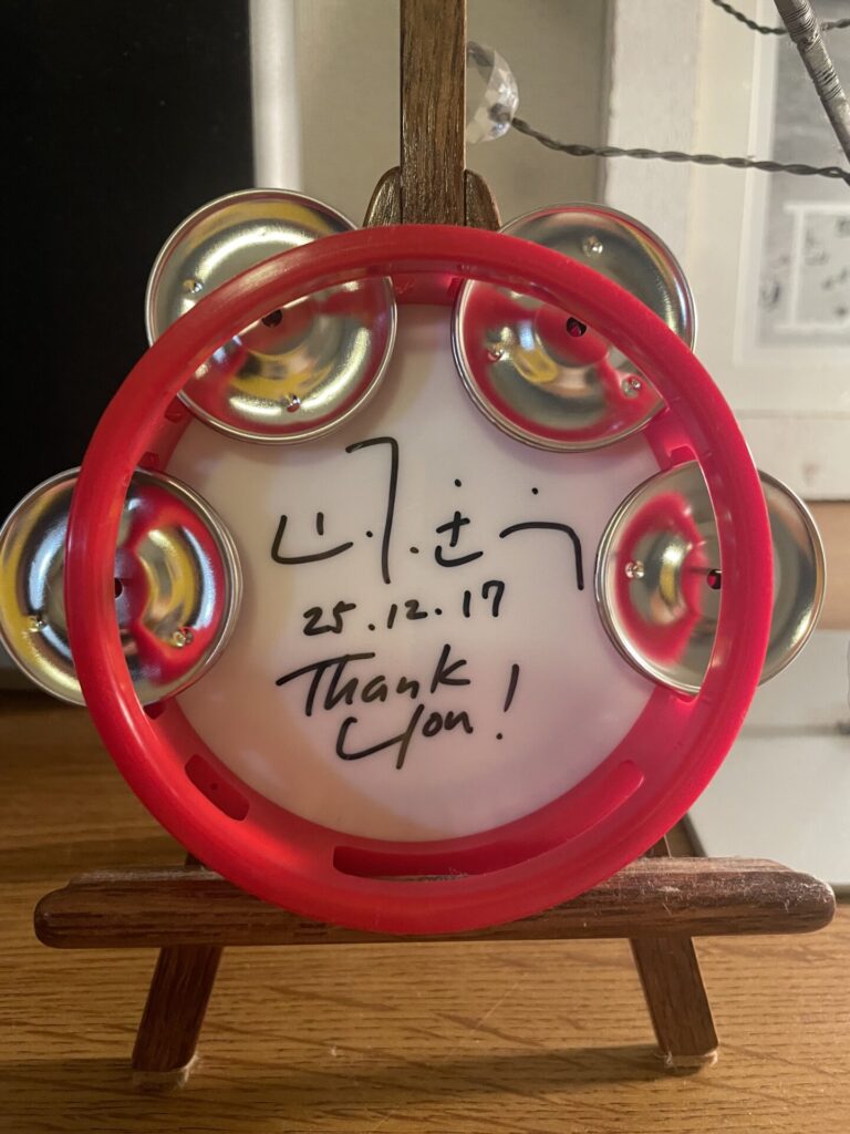 見るとサイン入りのミニタンバリンだった。もちろん彼女の手柄だろう。気分はまるで大谷翔平のホームランボール🥎をキャッチ🙌したのと同じくらい興奮した!🤩 なんというクリスマス🎄ギフトなんだ!🤩2700人の中で彼女がゲット!したのだ。こんな事は誰にでも起きうる事ではないからね。彼女はやたらと興奮していた!🫨