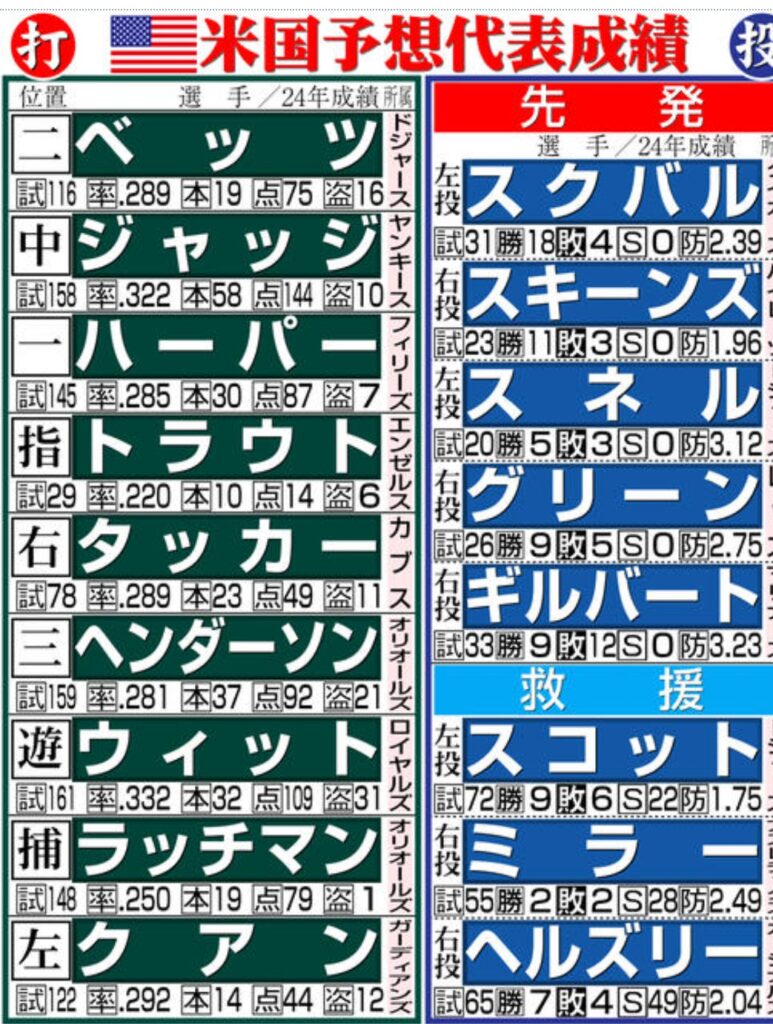 2026年WBCのアメリカ🇺🇸代表は、アーロン・ジャッジを主将に据え、ポール・スキーンズ、ボビー・ウィットJr.、さらにカル・ローリーやコービン・キャロル、PCAらMLBトップスターが続々と参加を表明し、文字通りのドリームチームで本気の布陣で日本を倒しに来る!🥶
