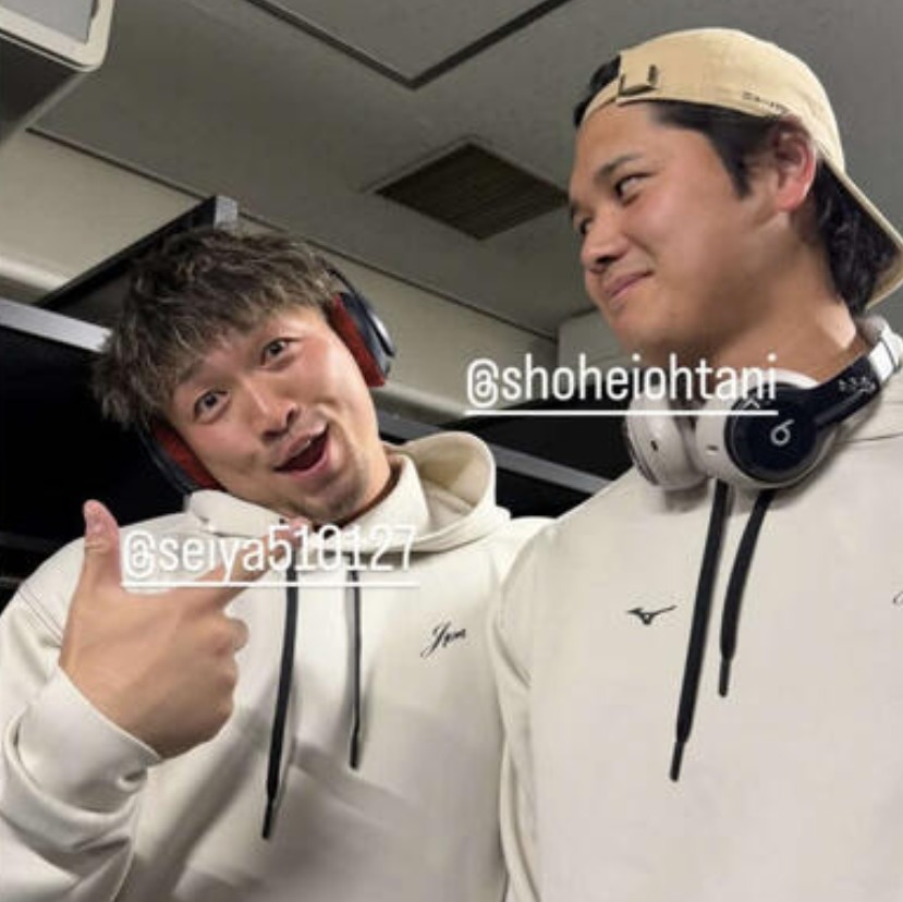 大谷はチェコ🇨🇿戦の試合後、自身のインスタグラムのストーリーズを怒涛の勢いで更新した。村上宗隆の満塁弾🏏や愛犬・デコピン🐶の安らかな寝顔などに続き、マイアミへ向かうチャーター機内で撮影されたとみられる鈴木との2ショット🤳を公開。、