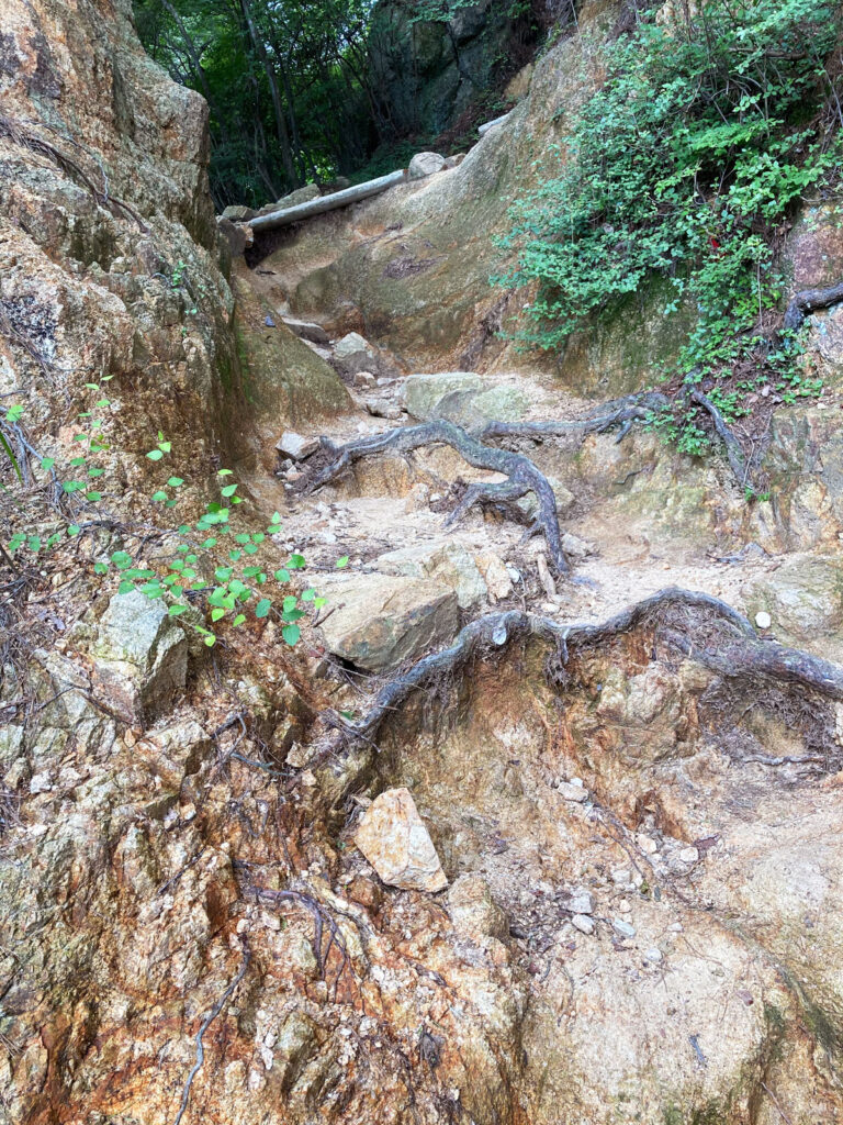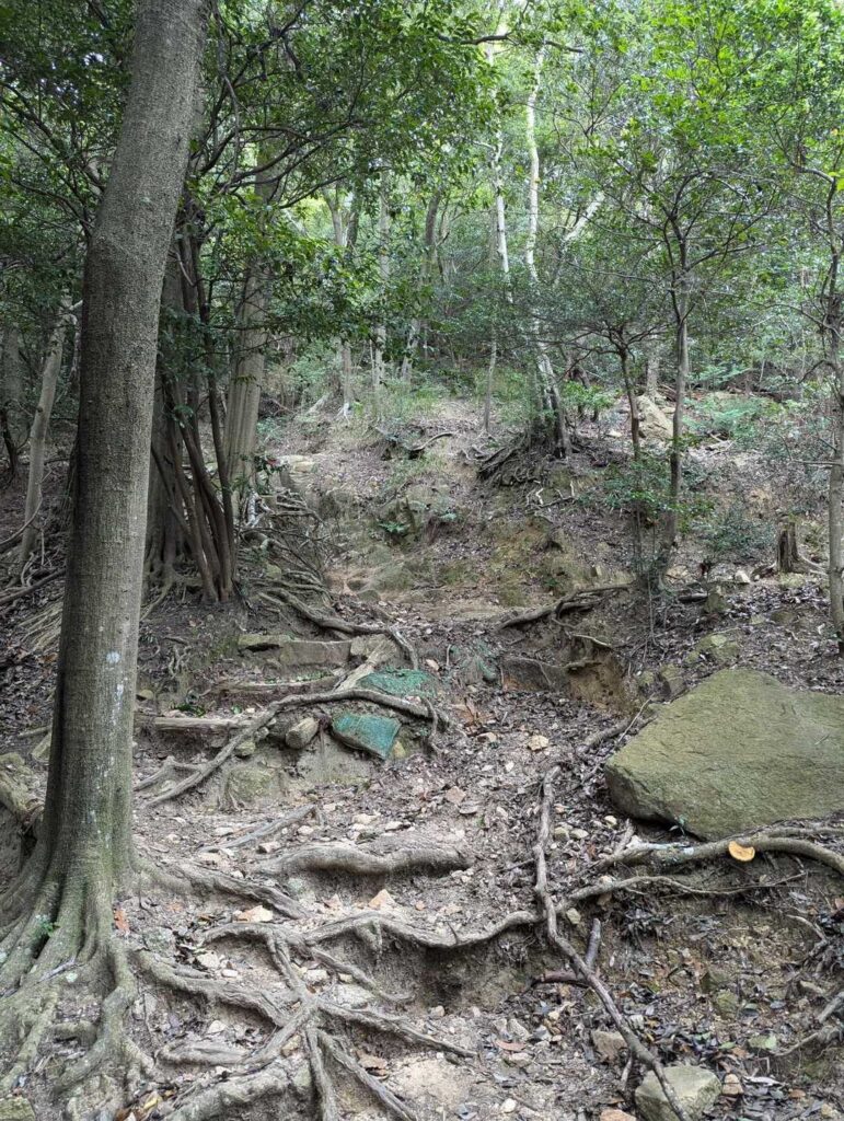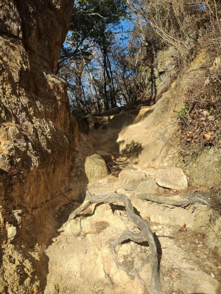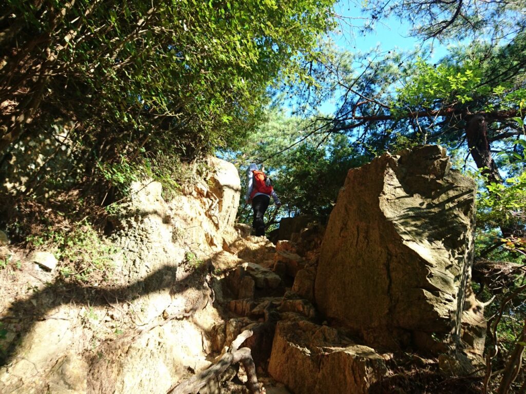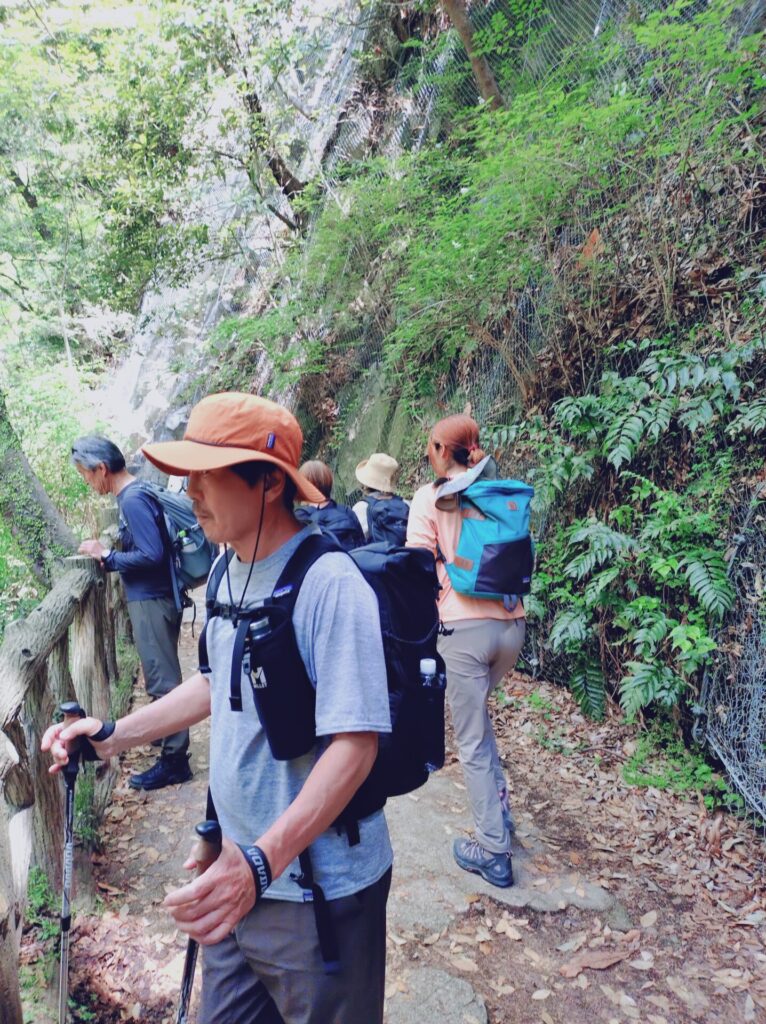 この岩場の難所は❝稲妻坂❞ちゅう名前らしい😬天狗道って聞くだけでもキツそうやのに…🥶もう太腿が悲鳴をあげて、休み休み出ないとこの岩場を登れない。20歩登ってはちょっと休みを入れた。平井君は500回以上山に登っているベテランで、ジョニーは年が6つも若い。でも、ハッチ🐝には驚いた!😮初参加なのにしんどい!とはほとんど言わない。おいらの滑落を防ぐために最後尾にいる。ヒィーヒィー🥵言ってるのはおいらだけだ!体重をもっと落とさんといかんな…🥴登山する人はみなスリムだ。おいらはデブではないけど、この4人の中では1番体重が重い。この石や岩だらけの難所で会った女性は、なんと宝塚から登ってきたらしく、既に5万歩歩いて来たらしい。4万〜5万步歩くのは普通らしくてビックらこいた!🫨年も50歳を越えてるだろうが、スリムな女性だ。やはり慣れなのか🤔…