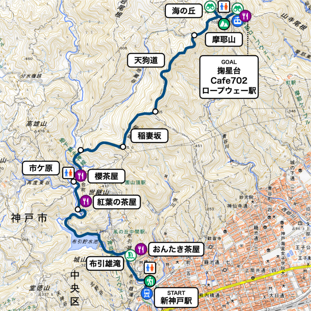 今日の登山コースは新神戸駅⇒布引の滝⇒市ヶ原⇒布引貯水池⇒稲妻坂⇒天狗道⇒掬星台(摩耶山頂)というビギナーコースらしい。